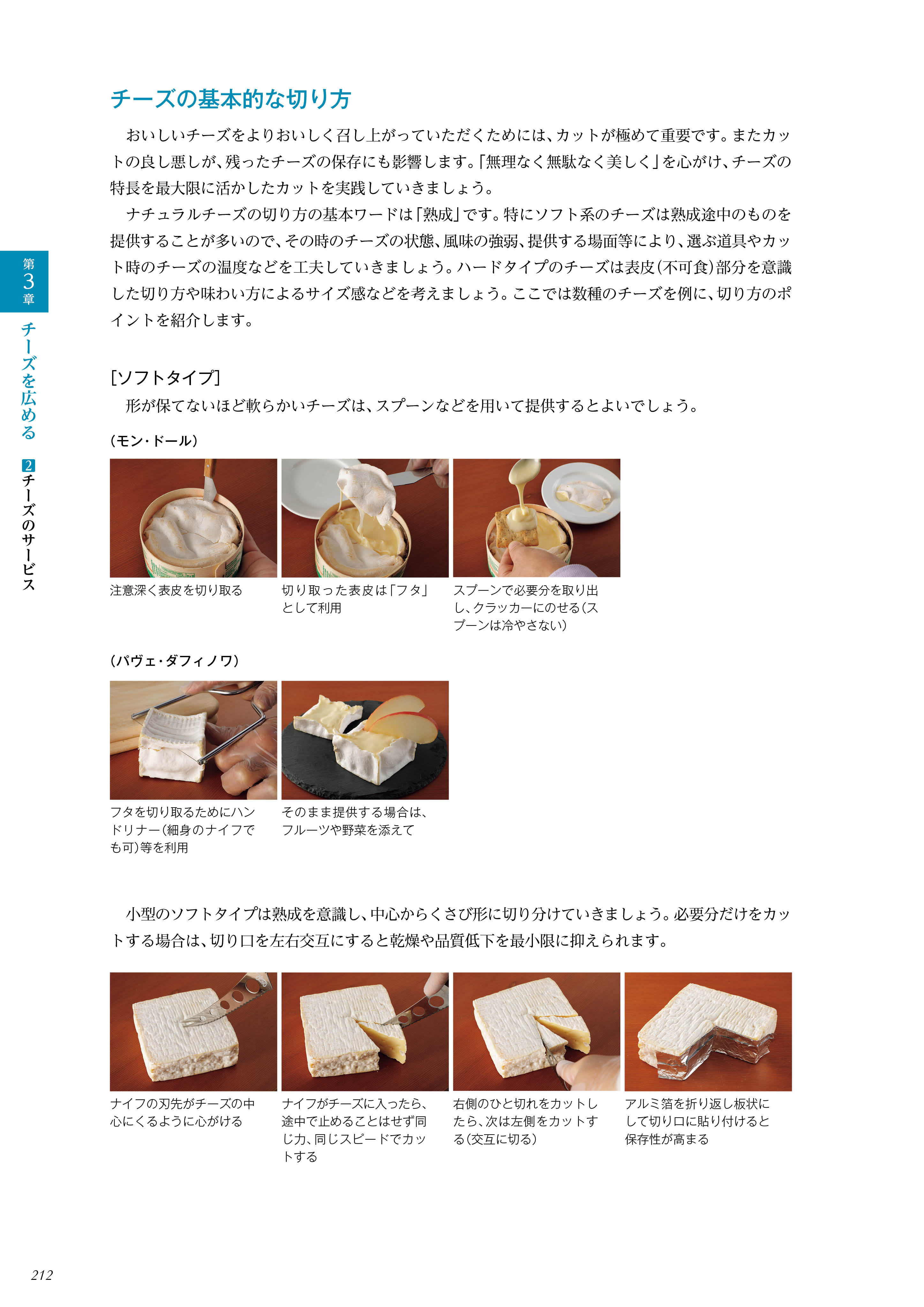 これからプロを目指す人に向け、現場で役立つ実用的な情報も充実させました。「チーズの販売」では各種法規や必要な表示項目について、「チーズのサービス」ではカッティング方法からサービス一連の流れなどを詳細に解説、現場で役立つ一冊となっています。