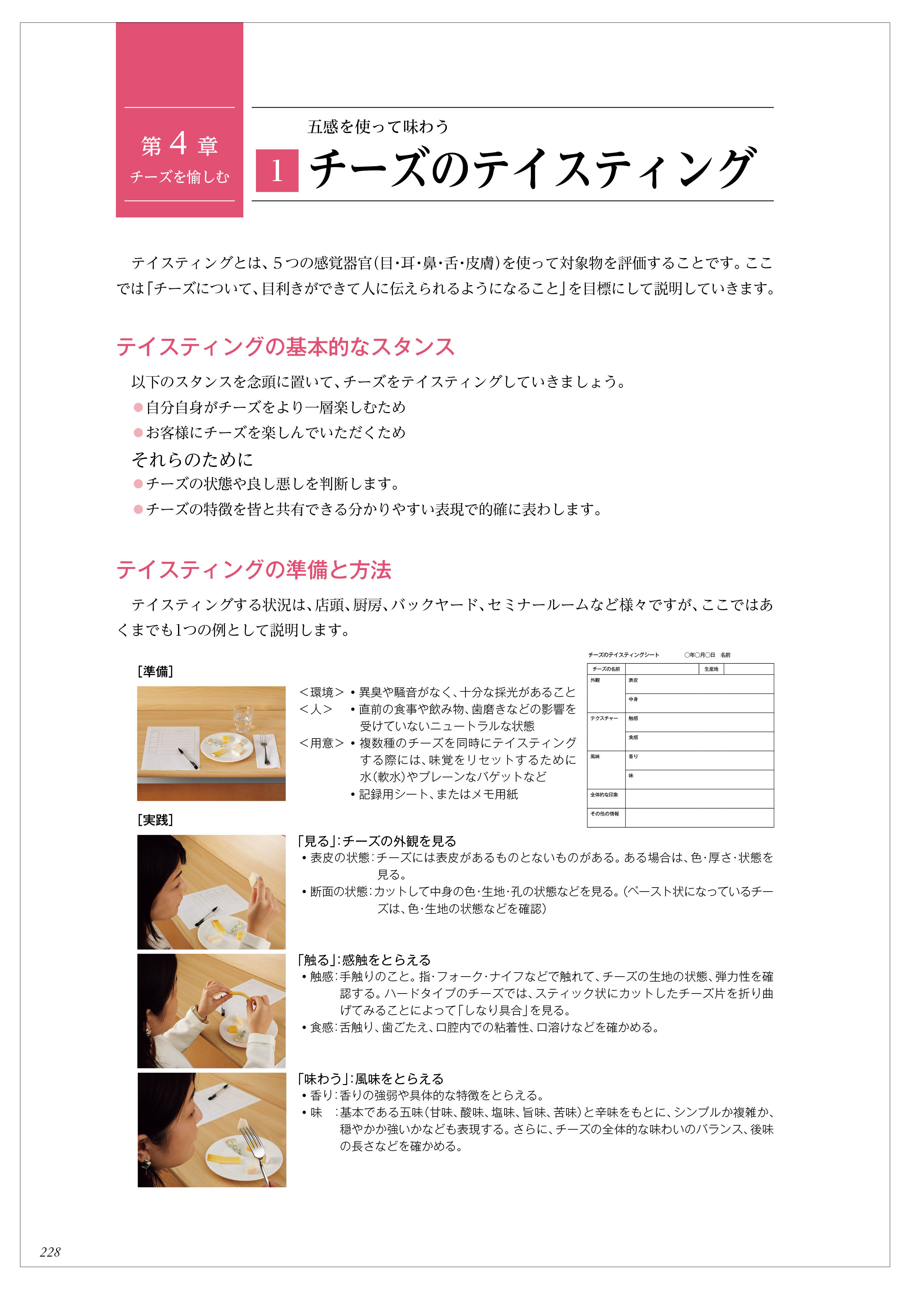チーズを食する際の愉しみ方を学ぶ章です。テイスティングの方法や料理、飲み物との相性について紹介されています。